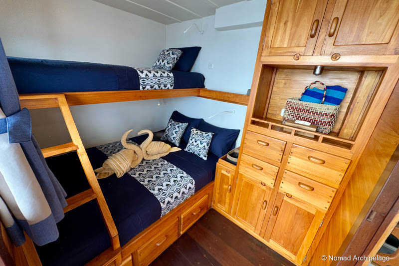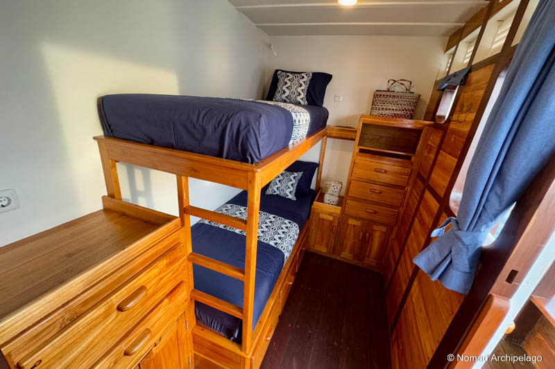 Die Kabinen befinden sich auf dem Hauptdeck und sind mit großen Fenstern, Deckenventilatoren, privaten Badezimmern, Schreibtischen, Leselampen, 220V-Steckdosen, ausreichend Stauraum, Handtüchern, umweltfreundlichen Pflegeprodukten und täglichem Reinigungsservice ausgestattet. Zwei der Kabinen sind mit einem Doppelbett (140 x 200 cm) und einem zusätzlichen Einzelbett (90 x 200 cm) ausgestattet, während die anderen beiden Kabinen über zwei Einzelbetten (80 x 200 cm) verfügen. Die natürliche Belüftung durch die Meeresbrise macht Klimaanlagen überflüssig und trägt zur umweltfreundlichen Ausrichtung des Schiffs bei.