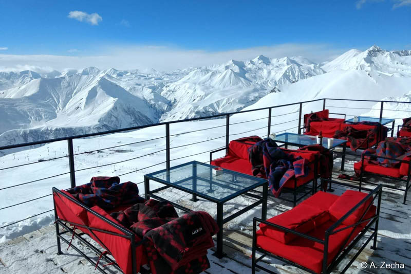 Das Hotel liegt direkt im Skigebiet und bietet 58 moderne Zimmer mit Balkon und Panoramablick auf die Berge. Die Ausstattung umfasst komfortable Betten, kostenloses WLAN, Flachbild-TV und ein eigenes Bad. Nach dem Skifahren kannst du im Wellnessbereich mit Sauna und Whirlpool entspannen. Das Restaurant serviert internationale und georgische Küche, die Bar lädt zu gemütlichen Abenden ein. Die Lage ist ideal für Wintersportler und Ausflüge in die Region Kazbegi.