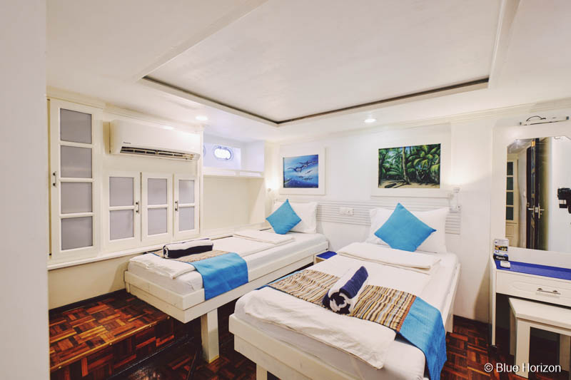 Sie verfügt über 12 Kabinen mit Platz für bis zu 24 Gäste. Auf dem Oberdeck befinden sich 3 Deluxe-Kabinen, jeweils mit einem King-Size-Doppelbett und einem zusätzlichen Einzelbett sowie großen Fenstern mit Meerblick. Auf dem Hauptdeck liegt eine Standardkabine mit Doppelbett und einem weiteren Einzelbett im Etagenstil. Das Unterdeck beherbergt 8 Standardkabinen, die teils mit Doppelbetten, teils mit zwei separaten Einzelbetten ausgestattet sind. Alle Kabinen verfügen über Klimaanlage und ein eigenes Badezimmer mit Dusche, Toilette und Warmwasser. Zwei Kabinen (#3 & 6) sind mit getrennten Betten gestaltet, was mehr Flexibilität und Privatsphäre ermöglicht.