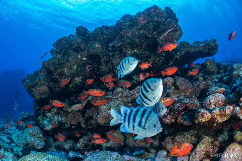 Die Unterwasserwelt ist spektakulär: Lavatunnel, Bögen, Grotten und Steilwände prägen die Szenerie. Wracks wie die RFA Darkdale (35–46 m) oder die SS Papa Nui (6–12 m) erzählen Geschichten aus vier Jahrhunderten. Schwärme von Saint-Helena-Falterfischen umhüllen die Felsen wie ein lebender Teppich. In der Hochsaison sind Walhaie fast garantiert, dazu Mobulas, Karettschildkröten, Wahoos und Delfinschulen.