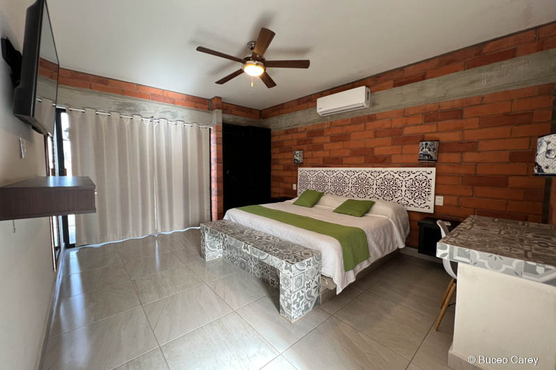 Die Villa Carey ist ein speziell für Taucher entworfenes Gästehaus in La Paz und steht nur für die Taucher und Begleitpersonen von Buceo Carey Divecenter zur Verfügung. Das Gebäude verfügt über mehrere Etagen mit Zimmern, Gemeinschaftsbereichen, Pool und Dachterrasse. Insgesamt stehen 18 Standardzimmer und 2 Suiten zur Verfügung; die Standardzimmer sind in der Regel mit einem Doppelbett und einem zusätzlichen Einzelbett ausgestattet, die Suiten verfügen über ein Kingsize‑Bett und einen Balkon mit Meerblick. Alle Zimmer haben ein eigenes Bad, Klimaanlage, WLAN und ausreichend Stauraum für Ausrüstung und Kleidung. Für Unterwasserfotografen gibt es eigene Arbeitsflächen mit 220‑Volt‑Anschlüssen (auch in europäischem Standard), 110‑Volt‑Steckdosen und USB‑Ports, sodass Akkus und Technik komfortabel vorbereitet werden können.