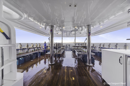 Auf dem Sonnendeck stehen großzügige Liegeflächen zur Verfügung, teilweise überdacht, ideal zum Entspannen zwischen den Tauchgängen. Außenduschen, Kameraspülbecken, eine professionelle Kamerastation sowie Ladestationen für Tauch- und Fotoequipment sind vorhanden. WLAN steht an Bord kostenfrei zur Verfügung, abhängig von der Netzabdeckung.