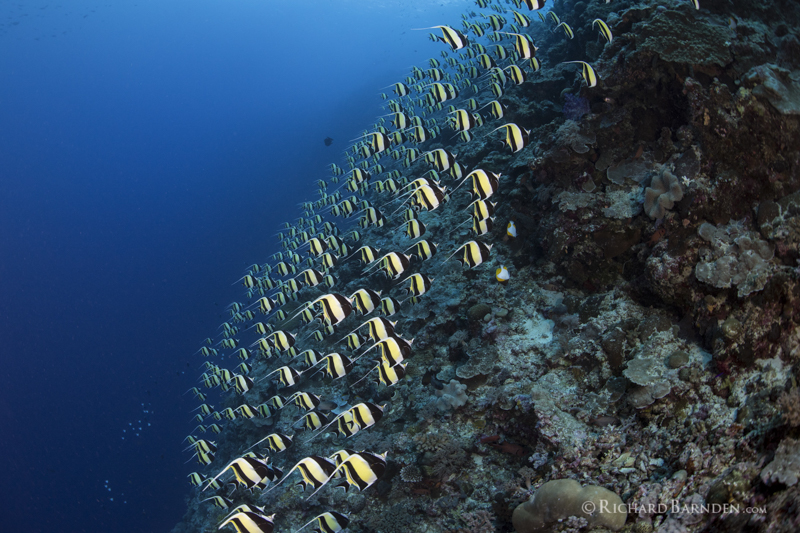 Richard Barnden führt und fotografiert seit fast zwanzig Jahren Meereslebewesen, vor allem im Pazifischen Ozean. Seine Leidenschaft gilt Laichansammlungen und Blackwater-Nachttauchgängen. Nachdem er eine große Sammlung von Daten und Fotos von Laichansammlungen angelegt hatte, verbrachte er die letzten zehn Jahre damit, diese und ihre Vorhersagbarkeit zu erforschen. Im Im Jahr 2015 stellte Richard ein bahnbrechendes Tauchteam zusammen, um den Zeitpunkt des Laichens des Getarnten Zackenbarsches (Epinephelus polyphekadion) in Palau zu bestimmen, wofür er fast sieben Jahre brauchte. Drei Jahre später, im Jahr 2018, stellte Richard auch ein Team von JJ-CCR Kreislaufgerätetauchern zusammen, um zu versuchen, einige der Ähnlichkeiten und Unterschiede zwischen derselben Zackenbarschart, die in Fakarava, Französisch-Polynesien, und im Ulong-Kanal, Palau, laicht, aufzudecken. Obwohl er in erster Linie das Laichen der Zackenbarsche dokumentieren wollte, war Richard auch in Fakarava, um das Jagdverhalten der Haie zu beobachten, das Laurent Ballesta und sein Team einige Jahre zuvor entdeckt hatten. Diese Expedition führte dazu, dass Richard mit seiner Aufnahme „The Gauntlet“, die zwei Graue Riffhaie zeigt, die nachts einen verängstigten Papageienfisch zerfleischen, zum Unterwasserfotografen des Jahres und zum britischen Unterwasserfotografen des Jahres 2019 gewählt wurde. http://www.richardbarnden.com/