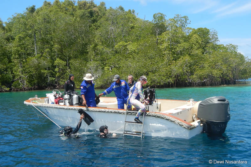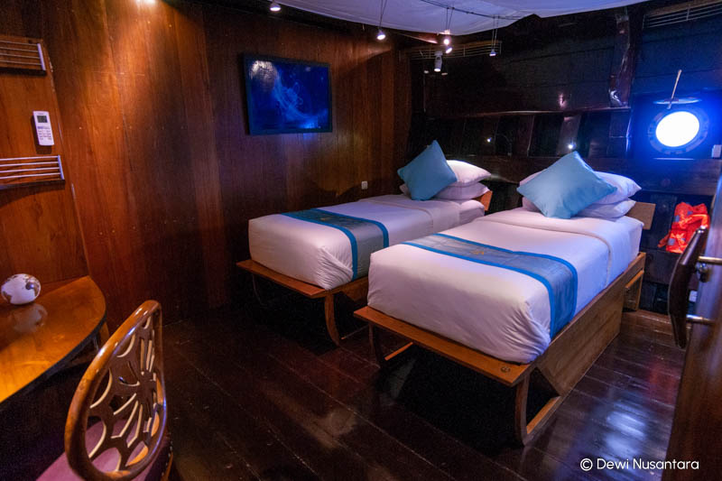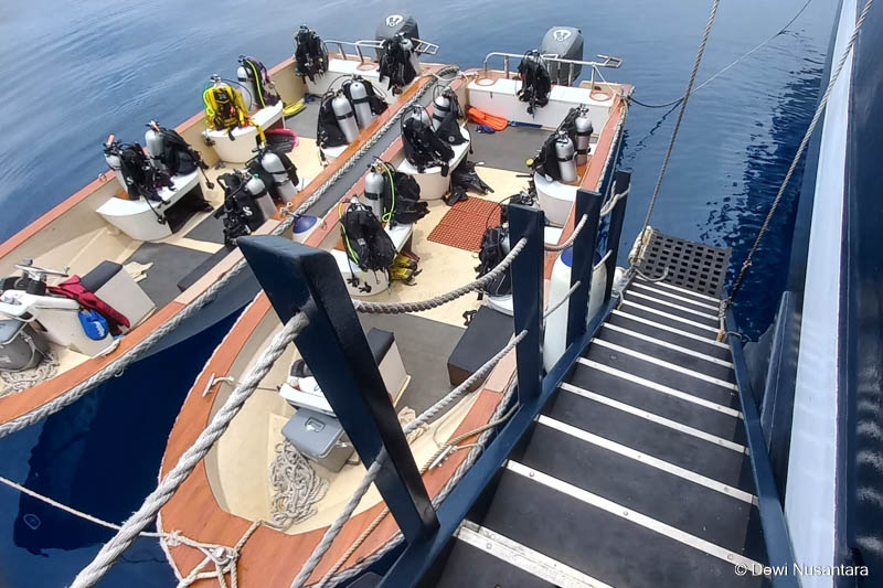 Der im Jahr 2008 vom Stapel gelaufene Motorsegler „Dewi Nusantara“ ist mit ihren 58 Metern Länge und 12 Metern Breite eines der größten und luxuriösesten Tauchsafarischiffe in Indonesien und bietet somit viel mehr Platz als andere Schiffe. Die Yacht ist ganz aus Holz, in der Bauweise eines traditionellen indonesischen Schoners gefertigt und bietet 18 Tauchern Platz.