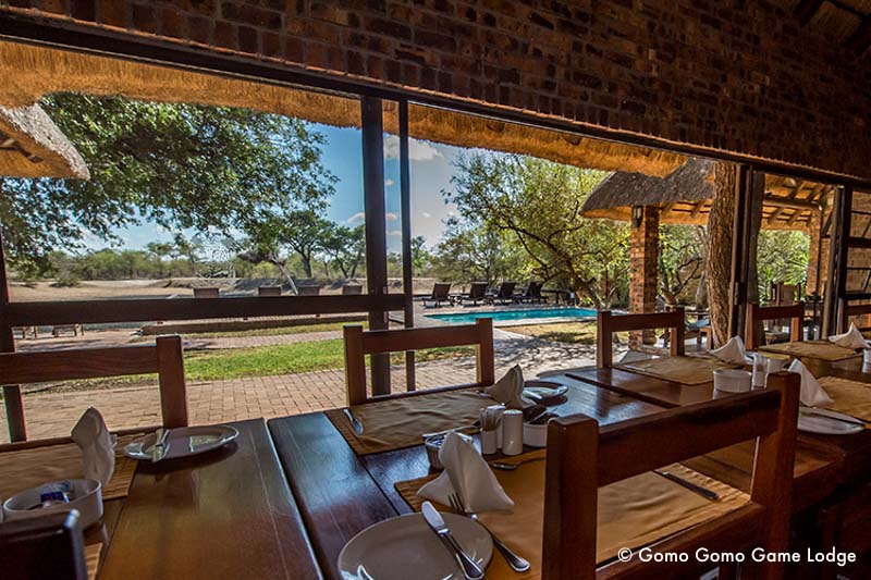 Die Gomo Gomo Game Lodge liegt direkt am Nhlaralumi-Fluss und bietet eine spektakuläre Aussicht auf die umliegende Wildnis. Die Unterkunft besteht aus fünf strohgedeckten Chalets für jeweils zwei oder vier Gäste sowie vier Luxuszelten im ostafrikanischen Stil. Alle Chalets sind modern eingerichtet und verfügen über Bad und WC, Terrasse, Minibar, Deckenventilatoren, Fliegengitter an Türen und Fenstern sowie 240-Volt-Stromanschluss. Die Zelte sind traditionell gebaut und bieten ein authentisches Safari-Gefühl mit hohem Komfort. Eine große Aussichtsveranda ermöglicht einen 180°-Blick auf den Fluss und das Wasserloch, an dem regelmäßig Elefanten und andere Tiere erscheinen.