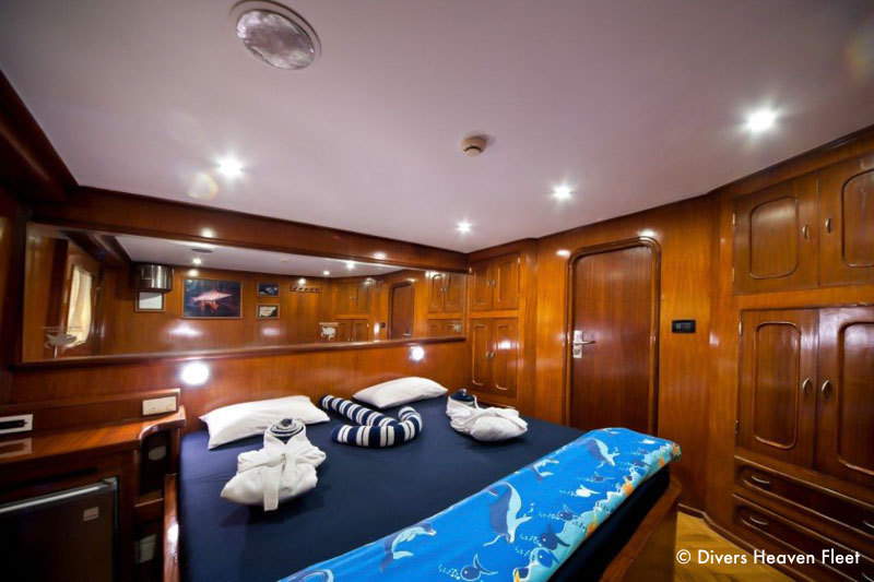 Die Heaven Saphir ist ein 36 Meter langes Stahlschiff mit drei Decks und großzügigen Gemeinschaftsbereichen. Auf dem Unterdeck befinden sich sechs Standardkabinen mit Twin-Betten, Klimaanlage, Kühlschrank und eigenem Bad (je ca. 10 m²). Das Oberdeck bietet drei Honeymoon-Suiten mit Doppelbetten (13 m²), während die Executive Suite auf dem Mitteldeck mit 20 m² Platz für bis zu drei Personen bietet – ideal für Familien mit Kind. Alle Kabinen verfügen über Stauraum, Musiksystem und elektronisch gesteuerte Sanitäranlagen.