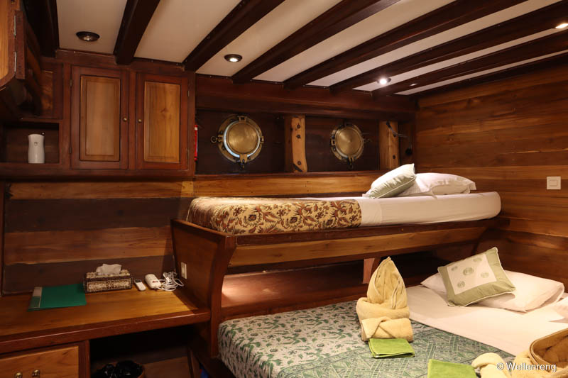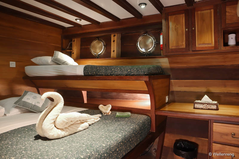 Die MS Wellenreng ist ein traditionelles indonesisches Holzschiff, das den Charme eines klassischen Seglers mit moderner Funktionalität verbindet. Das Schiff verfügt über drei Decks, die jeweils unterschiedliche Bereiche für Komfort und Entspannung bieten. Auf dem Hauptdeck befindet sich der Salon mit einer gemütlichen Sitzecke und einem Essbereich, in dem die Mahlzeiten serviert werden.