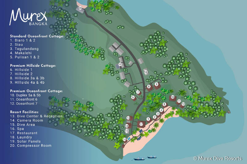 Allgemeine Fakten und Lage des Resorts: Die Insel Bangka liegt nur 20 Minuten vom Festland Nordsulawesis entfernt. Das Murex Bangka liegt in einer eigenen privaten Bucht mit einer atemberaubenden Lagune und zwei Hausriffen. Die Ocean Front Cottages liegen am Rande des palmengesäumten, weißen Sandstrandes, während die Hillside Deluxe Cottages eine erhöhte Position mit Blick auf das Resort und den Ozean einnehmen.