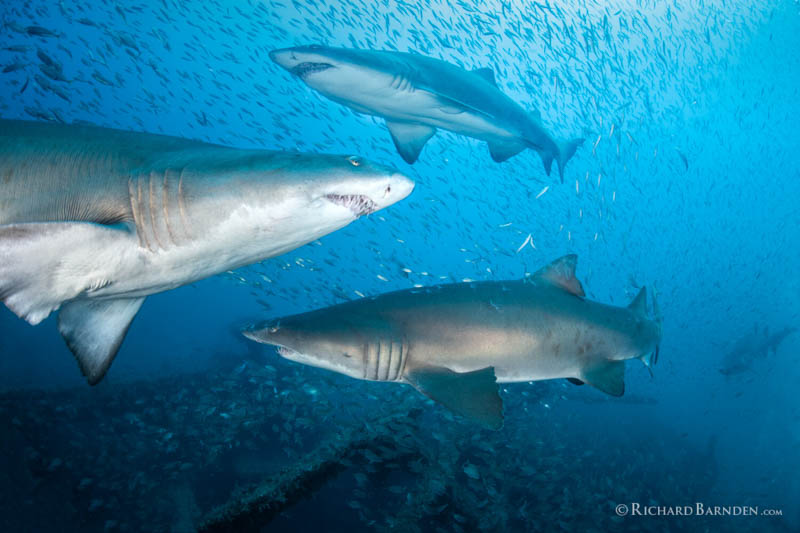 Mit ihrer bizarren Zahnstellung wirken Sandtigerhaie furchteinflößend, verhalten sich jedoch meist ruhig. Gute Plätze sind Queensland (Australien), North Carolina (USA), Protea Banks und Aliwal Shoal (Südafrika) sowie neuerdings Boa Vista (Kapverden).