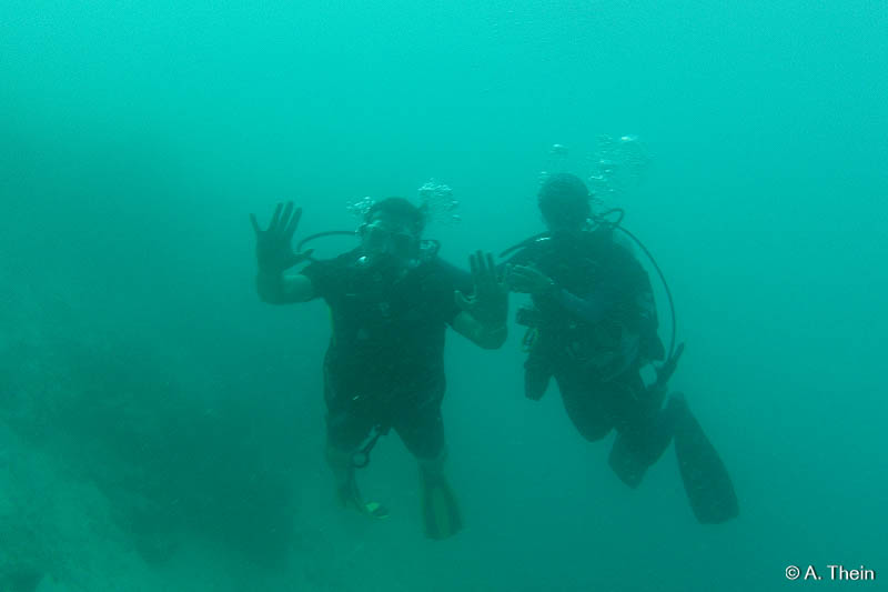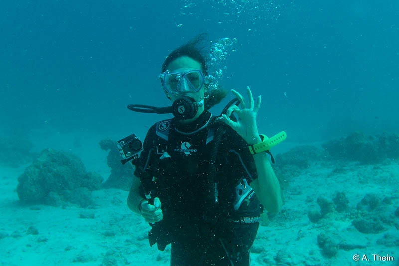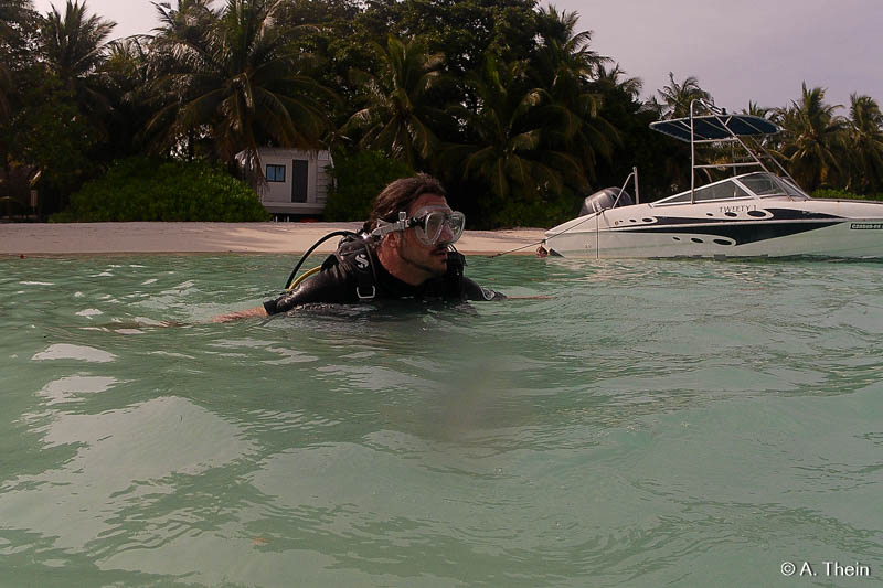 Wir konnten Refresher & TryScuba gleich gemeinsam machen, was natürlich super war. Der Instruktor, bei uns Ila, nimmt sich wirklich ausreichend Zeit, erklärt die ganzen Komponenten und den Zusammenbau, wo mir sowieso nicht mehr alles klar war. Es werden die Zeichen besprochen und einige andere wichtige Dinge und dann wird sich angezogen und ab in die Lagune. In der Lagune gibt es dann die ersten praktischen Übungen, wie Maske ausblasen oder wie man mit der richtigen Armbewegung wieder an sein Mundstück kommt, falls man es mal verliert. ;)