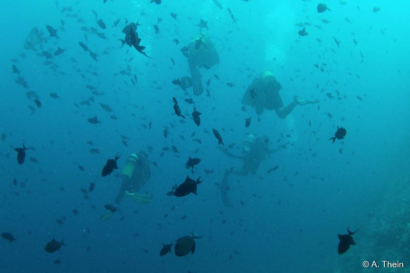 Für mich speziell großartig war, dass man ab dem ersten Tauchgang immer denselben Guide hat. In meinem Fall war das Ybbe, der seit über 15 Jahren dort taucht und jede Koralle kennt. Er hat mich gleich unter seine Fittiche genommen, mir laufend Tipps gegeben und mich aber auch gepusht und gefordert, z.B. indem er spontan mich die SMB aufblasen hat lassen. ;) Ich kann nur soviel sagen: Beim ersten Tauchgang hatte ich 6 kg, damit ich leichter abtauchen kann, und beim letzten Tauchgang nur mehr 3 kg, weil ich soooo entspannt war.
