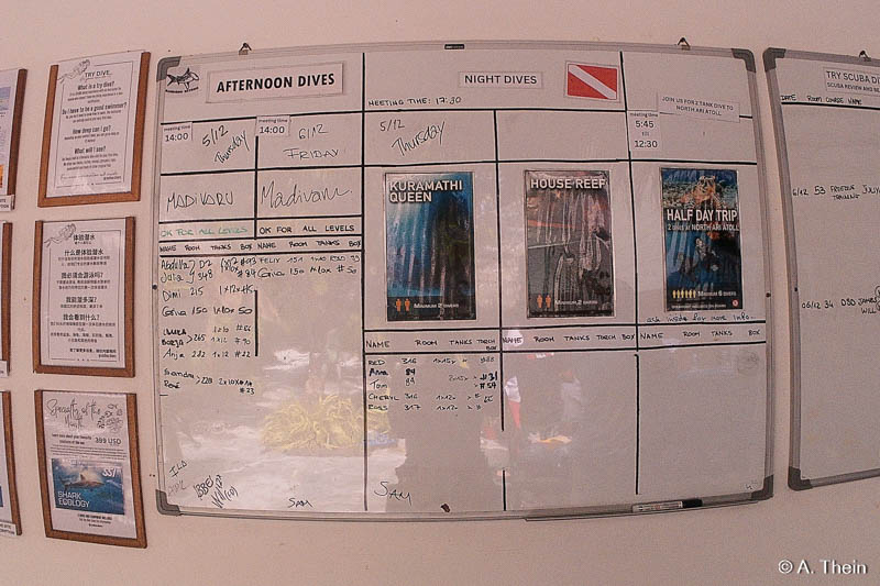Auf einer Tafel sind die geplanten Tauchgänge für den nächsten Tag angeschrieben. Du trägst dich ein mit Zimmernummer, welche Flasche + Füllung und Boxnummer. Dann steht immer alles wie gewünscht für dich bereit. Early-Morning-Dives und Nachttauchgänge werden ab 2 Personen angeboten, aber auch Halbtagsausfahren nach Nord-Ari mit 2 Tauchgängen oder Ganztagesausfahrten mit 3 Tauchgängen. Die Tauchgänge sind alle Strömungstauchgänge und es wird immer vorab geschaut, wie stark die Strömung ist, bevor man ins Wasser geht. Es gibt einige tolle Tauchspots in der Nähe, wie Madivaru oder Manta Block, die man auch gerne mal öfter besuchen kann.