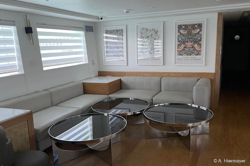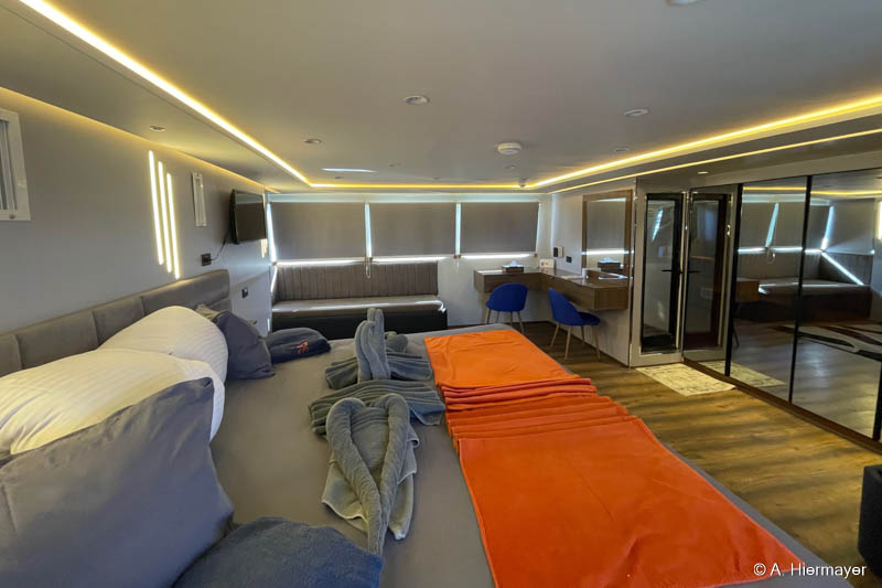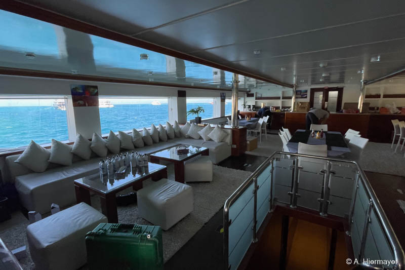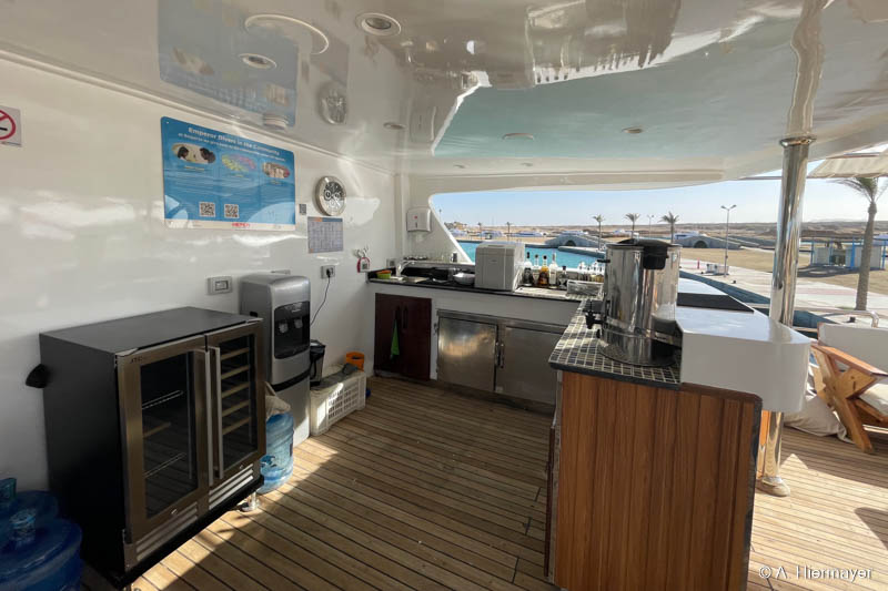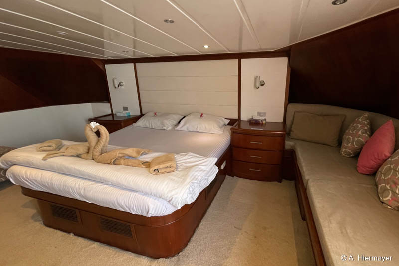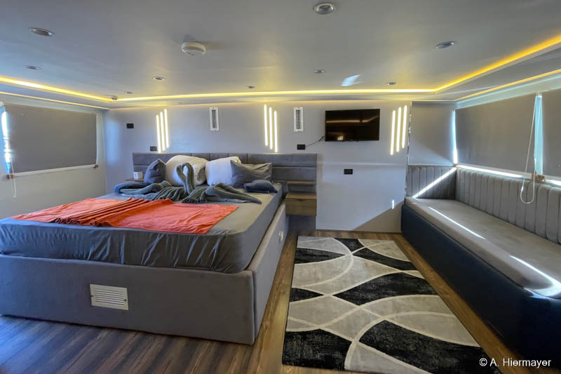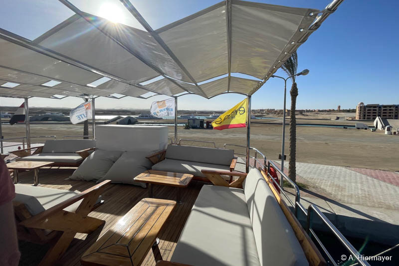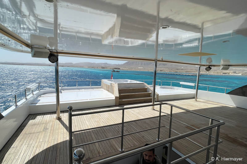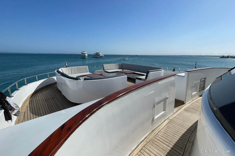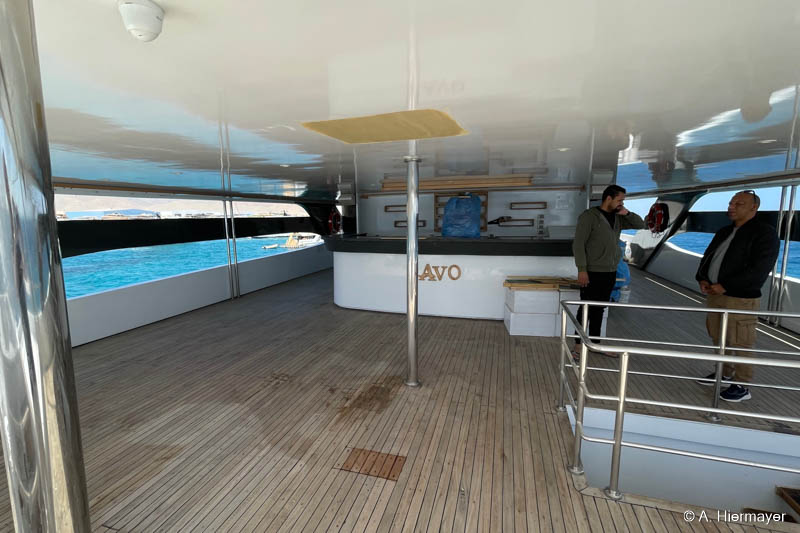 Ein Highlight der Tour war das brandüberholte AVO von Seamad Liveaboards. Das Schiff wurde in Safaga gerade frisch überarbeitet und bietet viel Platz sowie zahlreiche Holzdetails. Die Bar am Hauptdeck wurde neu gestaltet, die beiden Suiten erhielten einen eigenen Zugang und besitzen jeweils ein Jacuzzi sowie Sonnenliegen. Auch das Sonnendeck hat einen Whirlpool. Das Schiff war noch nicht komplett fertiggestellt, zeigte aber viel Potenzial und eine Größe, die für Gruppenreisen oder Safaris mit hohen Komfortansprüchen ideal ist.