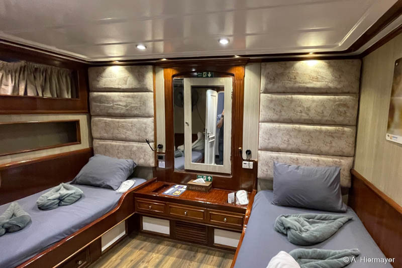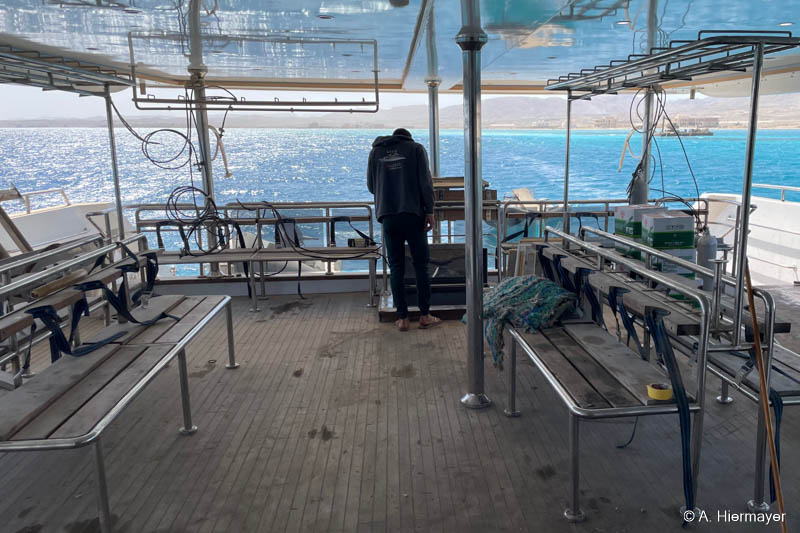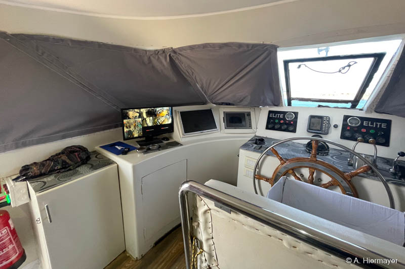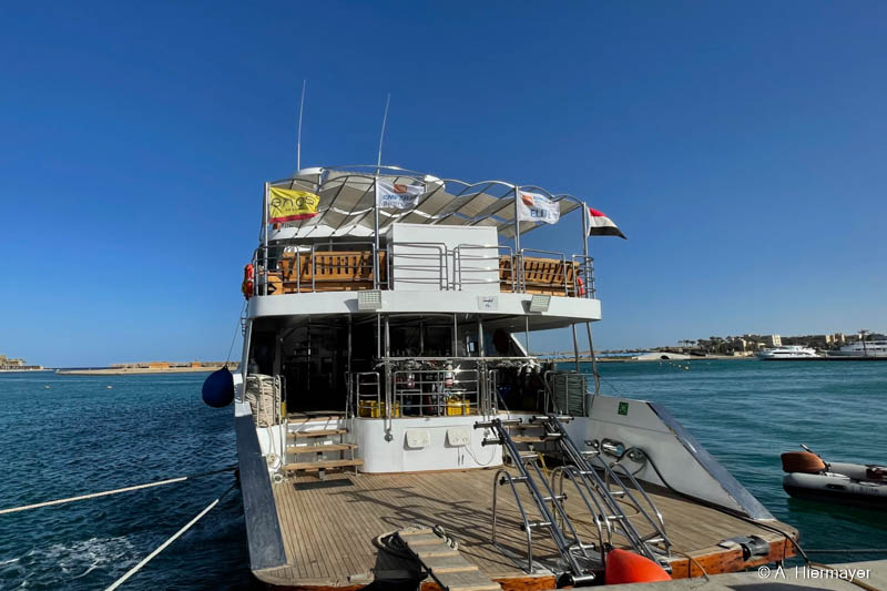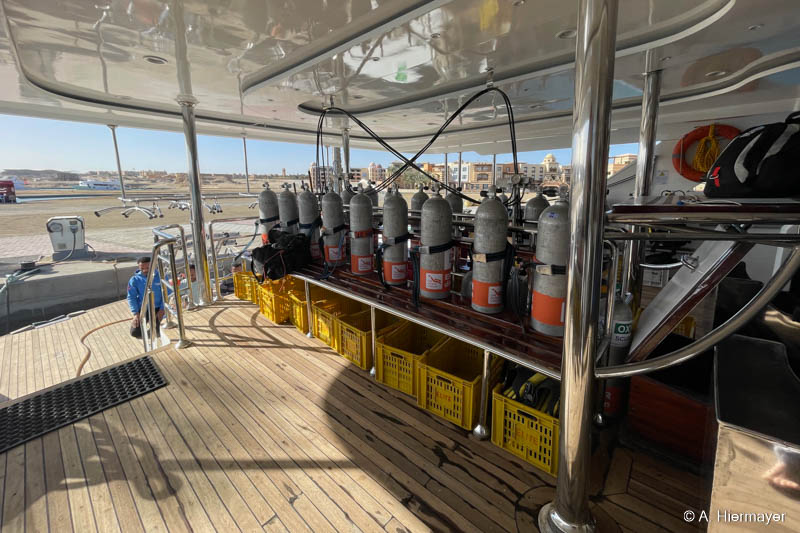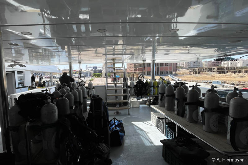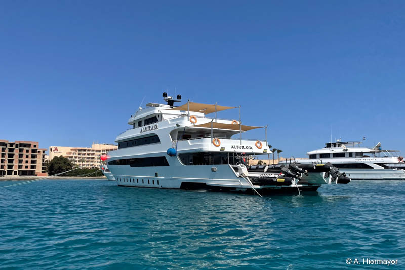 Im Hafen von Hurghada besuchte Andy anschließend die Alsuraya, die seit letztem Jahr neu in unserem Programm ist. Das Schiff befand sich kurz vor dem letzten Feinschliff vor der ersten offiziellen Ausfahrt. Die Ausstattung ist komfortabel und auf Taucher ausgerichtet, auch wenn ein wichtiges Sicherheitsfeature noch fehlt: ENOS oder ein anderes Ortungssystem. Der Reeder versprach allerdings, dies zeitnah nachzurüsten. Das Tauchdeck punktet mit durchdachten Ladestationen, zwei Toiletten und einer Dusche. Getaucht wird über Zodiacs, beide mit Leiter. Wer nur wenige Tauchgänge hat, sollte vorab Bescheid geben, da ein privater Guide notwendig sein kann.