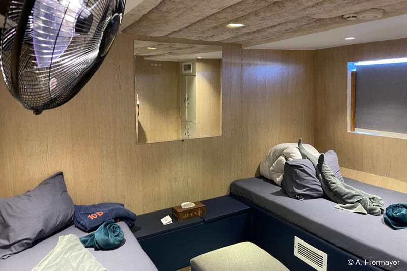 Das erste Schiff seiner Inspektion war die Emperor Elite, die bereits beim Betreten einen gepflegten Eindruck vermittelte. Sicherheit nimmt die Crew sehr ernst, was sich in Warnsystemen, Fluchtwegplänen und der allgemeinen Organisation widerspiegelt. Das Hauptdeck wirkt aufgeräumt und gut strukturiert. Unter Deck fallen die kräftigen Muster und Farben auf, die nicht jedermanns Geschmack sind, aber die Kabinen bieten viel Stauraum, individuell regulierbare Klimaanlagen und sogar Ventilatoren. Oberdeckkabinen haben kleine Fensteröffnungen und am Bug ist Rauchen erlaubt. Für Taucher wichtig: Die Zodiac‑Ausstattung ist gut, inklusive Leiter für den Einstieg.