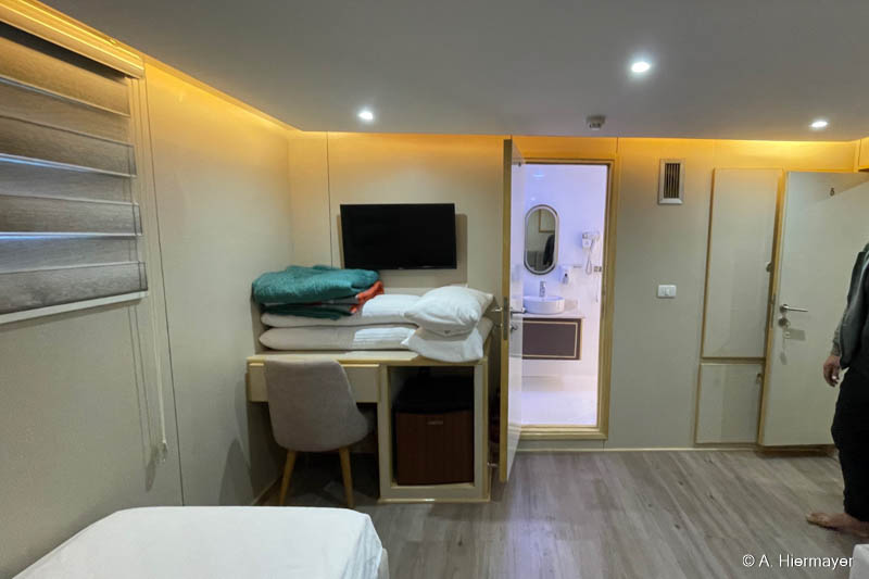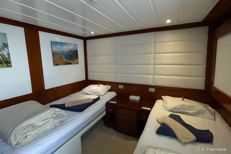 Danach folgten zwei weitere Schiffe der Emperor‑Flotte: die Emperor Superior und die Emperor Asmaa. Sie liegen zwischen dem Marriott und der Hurghada Marina, zugänglich über eine Anlage mit kleinem Strand, den Gäste vor oder nach der Safari nutzen können. Andy fand besonders das gut erhaltene Holzdekor ansprechend, das auf beiden Schiffen eine warme Atmosphäre erzeugt. Moderne Wandpaneele wirken im Vergleich etwas künstlich, aber die Sicherheitsstandards der gesamten Emperor‑Flotte sind bestens und machten einen zuverlässigen Eindruck.