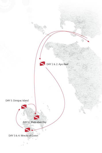 Die neueste spannende Route der Atlantis Azores führt dich zu den versunkenen Wracks des Zweiten Weltkriegs in der Bucht von Coron und über das Apo-Riff. Der typische Charter beginnt mit zwei Tagen Erkundung des 34 Meilen (ca. 55 km) langen Riffsystems des Apo Reefs, das oft als „Mini-Tubbataha“ bezeichnet wird. Shark Ridge ist ein großartiger Ort, um Weißspitzen- und Schwarzspitzen-Riffhaie zu sehen. Mantarochen werden hier manchmal gesichtet, ebenso wie Karettschildkröten und Büffelkopf-Papageienfische. Binangaan Drop Off ist ein weiterer fantastischer Ort mit riesigen Schulen von Schnappern und Thunfischen. Halte Ausschau nach gefleckten Adlerrochen im Blau sowie nach anderen pelagischen Arten.