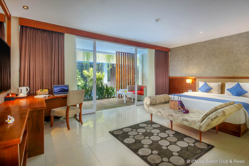 Das D’Nusa Beach Club & Resort liegt direkt am weißen Sandstrand von Nusa Lembongan und bietet eine entspannte Atmosphäre mit Blick auf das Meer. Die Anlage umfasst rund 50 Unterkünfte in verschiedenen Kategorien, darunter Standardzimmer, Deluxe-Zimmer, Villen und Poolvillen. Die Standard- und Deluxe-Zimmer sind in zweistöckigen Gebäuden untergebracht und verfügen über Klimaanlage, Safe, Minibar, TV, Kaffee-/Teezubereiter sowie Balkon oder Terrasse. Die Villen bieten mehr Platz und Privatsphäre, einige verfügen über einen eigenen Pool. Die Einrichtung ist modern und funktional, mit hellen Farben und klaren Linien.