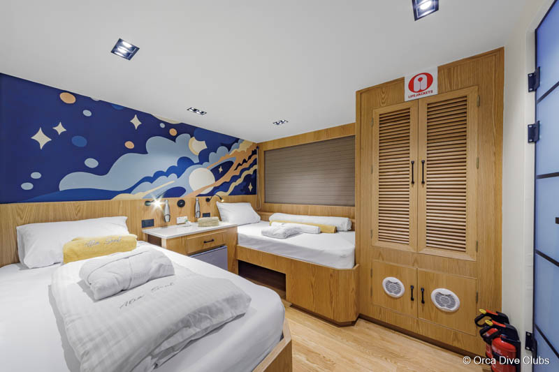 Sie verfügt die über zehn großzügige Kabinen und kann bis zu 20 Gäste beherbergen. 6 Doppelkabinen befinden sich im Unterdeck, 2 weitere Doppelkabinen sowie zwei Kabinen mit Queensize-Betten sind auf dem Oberdeck untergebracht. Alle Kabinen sind klimatisiert und mit einem eigenen Bad mit Dusche und WC ausgestattet. Handtücher und Bademäntel werden zur Verfügung gestellt. Tageslicht und natürliche Belüftung sorgen durch die Bullaugen für ein angenehmes Raumgefühl.