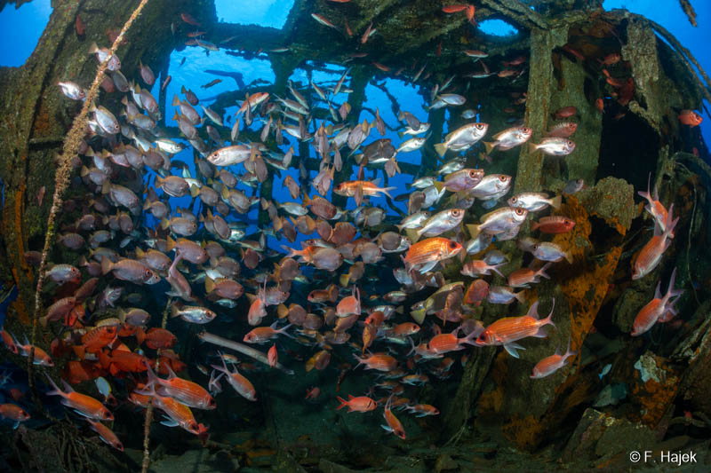 Das Wasser ist glasklar, die Sichtweiten liegen oft bei 40 bis 60 Metern. Die Artenvielfalt ist überwältigend: Schwärme von weißgelben Saint-Helena-Falterfischen umhüllen Felsen und Wracks wie ein lebender Schleier. In Spalten und Höhlen verstecken sich Langusten in ganzen Familienverbänden, während große Drachenköpfe und feuerrote Großaugenbarsche die Grotten bevölkern. Halbendemische Soldatenfische und zahlreiche andere Arten machen jeden Tauchgang einzigartig. Insgesamt warten acht historische Wracks darauf, entdeckt zu werden – darunter die berühmte RFA Darkdale.