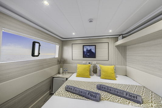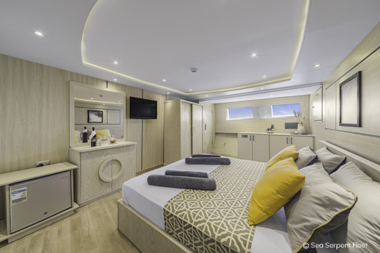 Auf dem Unterdeck befinden sich mehrere komfortable Twin-Kabinen sowie Doppelbettkabinen, während das Hauptdeck zusätzlich eine geräumige Suite beherbergt. Auf dem Oberdeck stehen weitere flexibel nutzbare Twin- oder Doppelbettkabinen sowie eine Panorama-Suite zur Verfügung. Insgesamt bietet die Sea Serpent Grand 14 Kabinen für maximal 28 Gäste. Alle Kabinen sind klimatisiert, verfügen über ein eigenes Bad mit großzügigen Duschen, Stauraum, Kühlschrank, Musiksystem und Meerblickfenster oder Bullaugen je nach Decklage. Die Bettenkonfiguration ist je nach Kabine als Twin- oder Doppelbett ausgelegt, teilweise flexibel anpassbar.