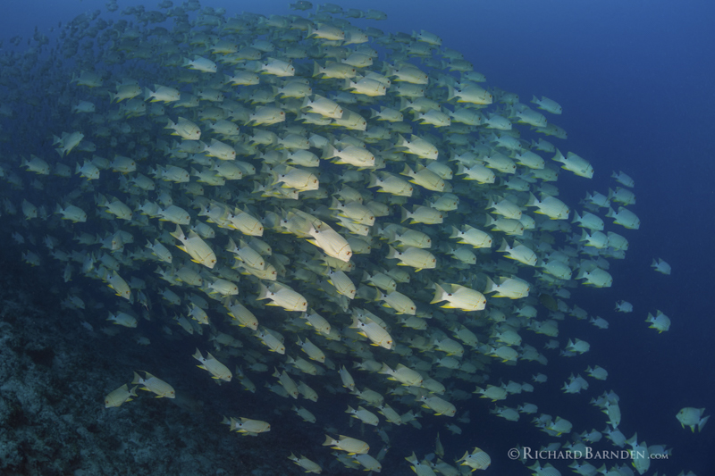 Richard Barnden führt und fotografiert seit fast zwanzig Jahren Meereslebewesen, vor allem im Pazifischen Ozean. Seine Leidenschaft gilt Laichansammlungen und Blackwater-Nachttauchgängen. Nachdem er eine große Sammlung von Daten und Fotos von Laichansammlungen angelegt hatte, verbrachte er die letzten zehn Jahre damit, diese und ihre Vorhersagbarkeit zu erforschen. Im Im Jahr 2015 stellte Richard ein bahnbrechendes Tauchteam zusammen, um den Zeitpunkt des Laichens des Getarnten Zackenbarsches (Epinephelus polyphekadion) in Palau zu bestimmen, wofür er fast sieben Jahre brauchte. Drei Jahre später, im Jahr 2018, stellte Richard auch ein Team von JJ-CCR Kreislaufgerätetauchern zusammen, um zu versuchen, einige der Ähnlichkeiten und Unterschiede zwischen derselben Zackenbarschart, die in Fakarava, Französisch-Polynesien, und im Ulong-Kanal, Palau, laicht, aufzudecken. Obwohl er in erster Linie das Laichen der Zackenbarsche dokumentieren wollte, war Richard auch in Fakarava, um das Jagdverhalten der Haie zu beobachten, das Laurent Ballesta und sein Team einige Jahre zuvor entdeckt hatten. Diese Expedition führte dazu, dass Richard mit seiner Aufnahme „The Gauntlet“, die zwei Graue Riffhaie zeigt, die nachts einen verängstigten Papageienfisch zerfleischen, zum Unterwasserfotografen des Jahres und zum britischen Unterwasserfotografen des Jahres 2019 gewählt wurde. http://www.richardbarnden.com/