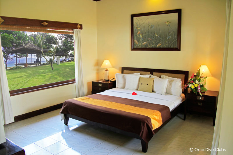 Wir haben 3 Hotels im Osten im Portfolio. Die Lotus Bungalows haben mit den Gangga Divers eine tolle Tauchbasis, sind aber leider auch schon ein bisschen in die Jahre gekommen. Man hat sich während meines Aufenthalts rührend um mich und die anderen Gäste gekümmert, aber dennoch braucht es dringend die eine oder andere Renovierung. Es gibt „nur“ 2- oder hin und wieder 3-Tank Ausfahrten. Ebenso ergeht es dem Puri Bagus, das eine Orca Tauchbasis mit super nettem Staff direkt im Hotel hat. Hier gibt es zusätzlich auch Fischerboote, die vom Hotel aus starten. Die Fischer bieten auch Schnorchelausflüge an.