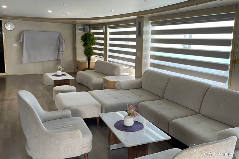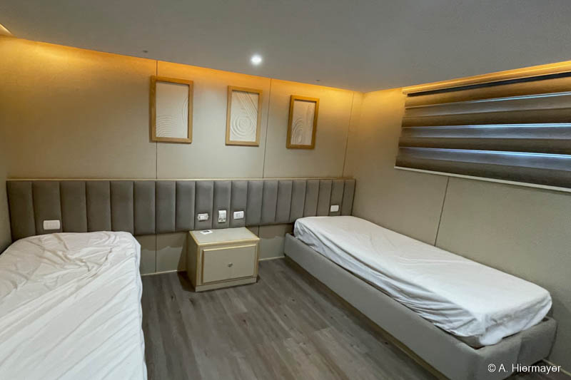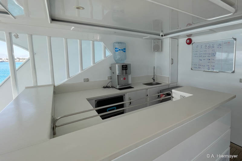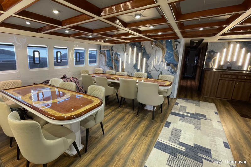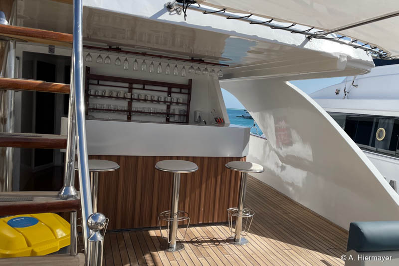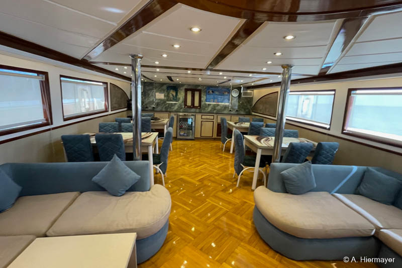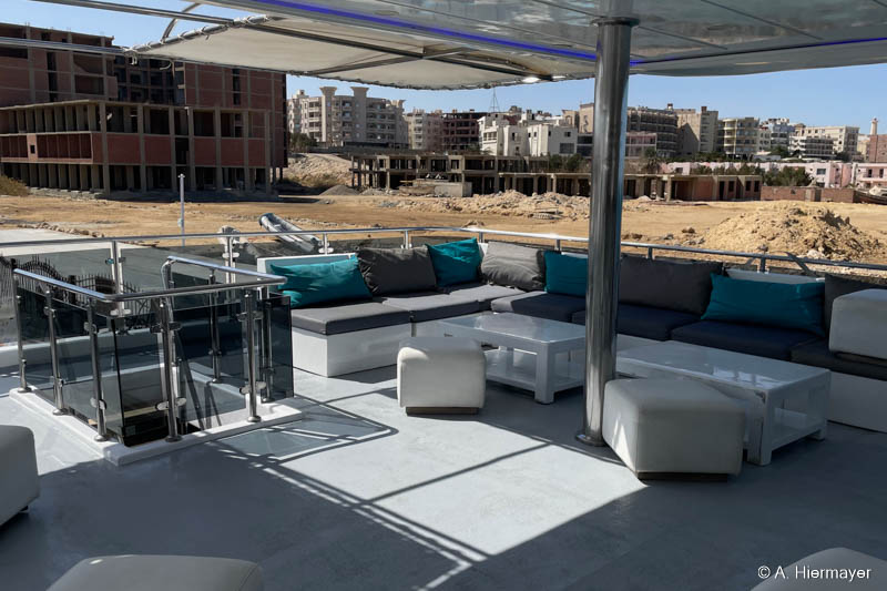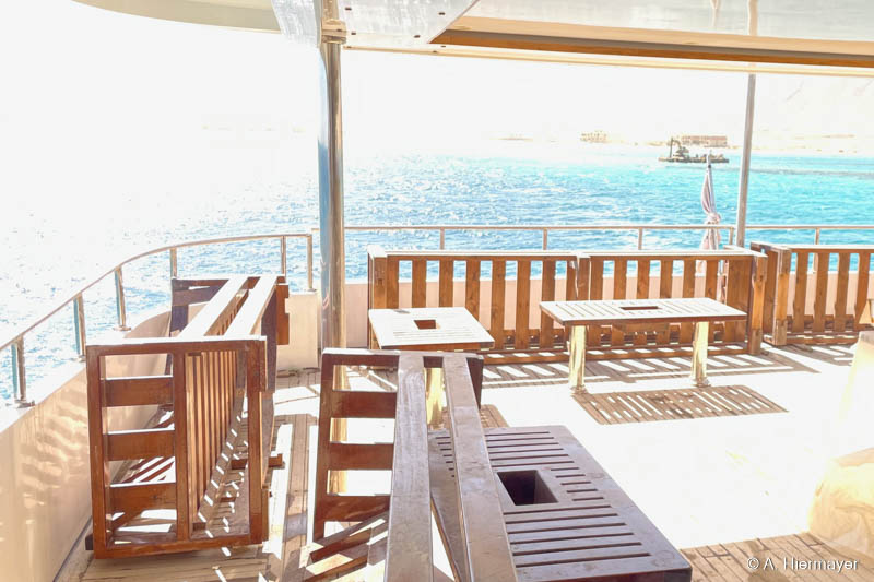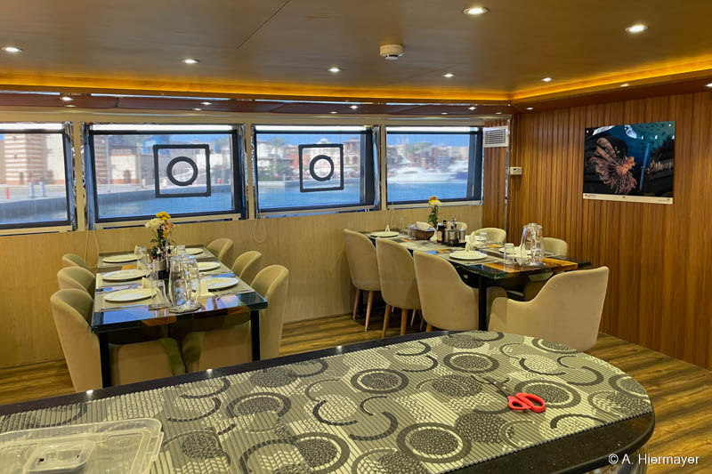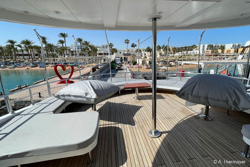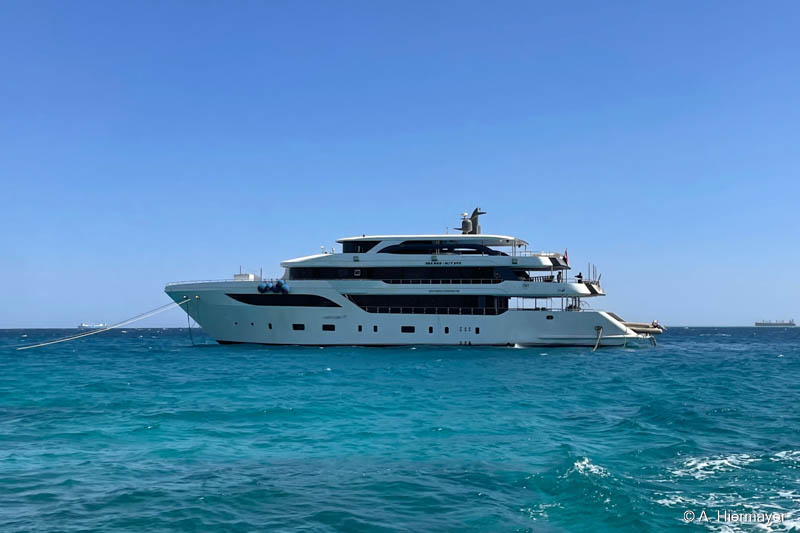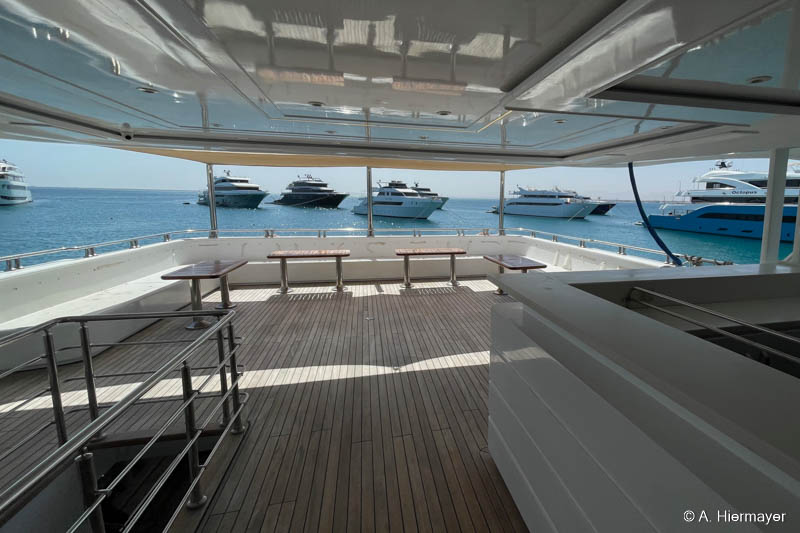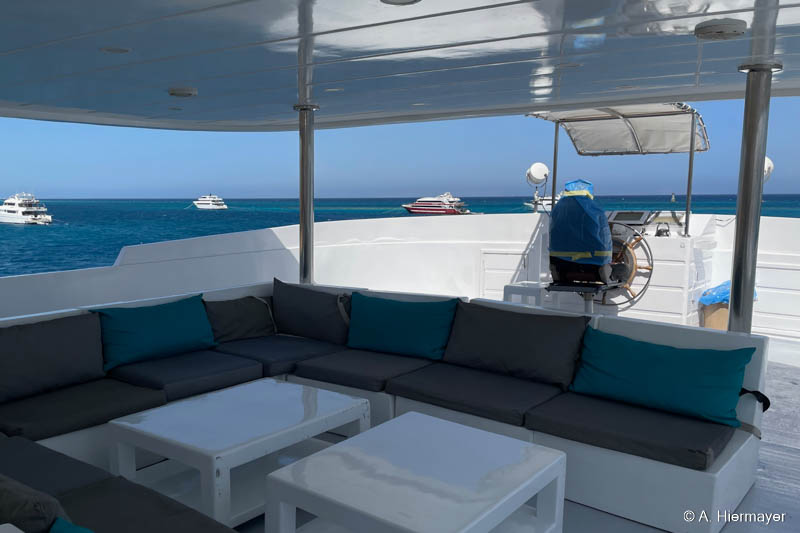 Ein Highlight der Tour war das brandüberholte AVO von Seamad Liveaboards. Das Schiff wurde in Safaga gerade frisch überarbeitet und bietet viel Platz sowie zahlreiche Holzdetails. Die Bar am Hauptdeck wurde neu gestaltet, die beiden Suiten erhielten einen eigenen Zugang und besitzen jeweils ein Jacuzzi sowie Sonnenliegen. Auch das Sonnendeck hat einen Whirlpool. Das Schiff war noch nicht komplett fertiggestellt, zeigte aber viel Potenzial und eine Größe, die für Gruppenreisen oder Safaris mit hohen Komfortansprüchen ideal ist.
