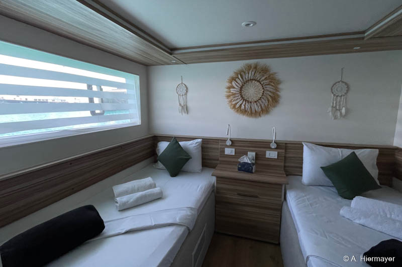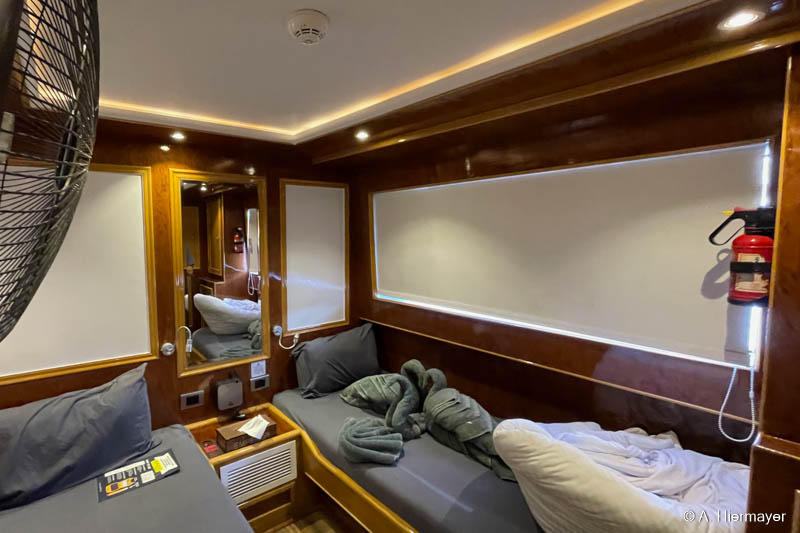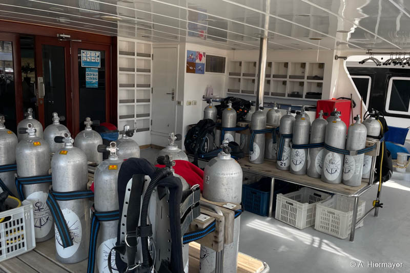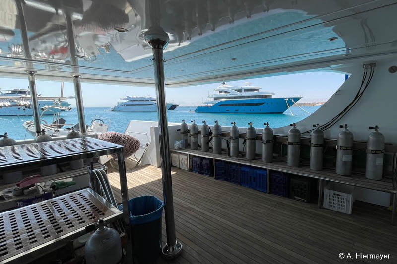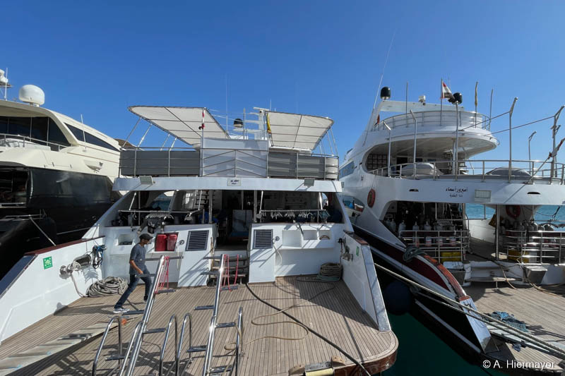 Im Hafen von Hurghada besuchte Andy anschließend die Alsuraya, die seit letztem Jahr neu in unserem Programm ist. Das Schiff befand sich kurz vor dem letzten Feinschliff vor der ersten offiziellen Ausfahrt. Die Ausstattung ist komfortabel und auf Taucher ausgerichtet, auch wenn ein wichtiges Sicherheitsfeature noch fehlt: ENOS oder ein anderes Ortungssystem. Der Reeder versprach allerdings, dies zeitnah nachzurüsten. Das Tauchdeck punktet mit durchdachten Ladestationen, zwei Toiletten und einer Dusche. Getaucht wird über Zodiacs, beide mit Leiter. Wer nur wenige Tauchgänge hat, sollte vorab Bescheid geben, da ein privater Guide notwendig sein kann.
