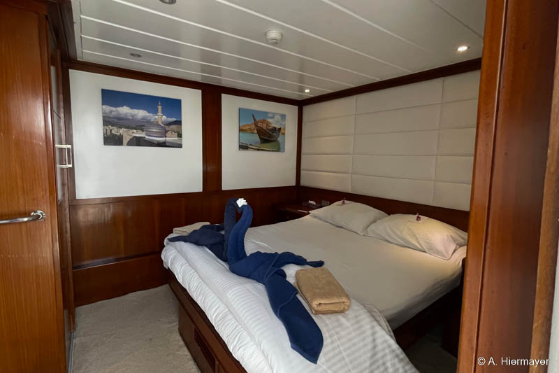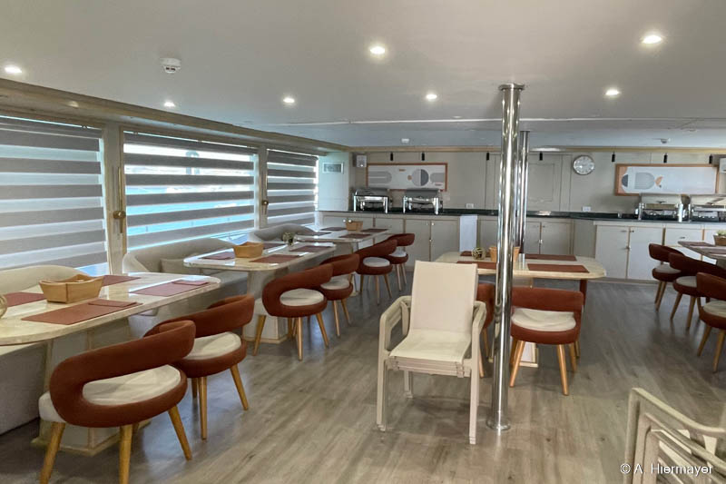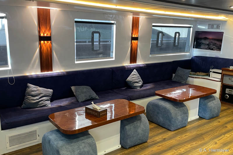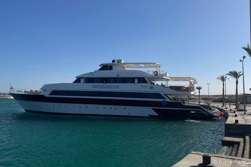 Danach folgten zwei weitere Schiffe der Emperor‑Flotte: die Emperor Superior und die Emperor Asmaa. Sie liegen zwischen dem Marriott und der Hurghada Marina, zugänglich über eine Anlage mit kleinem Strand, den Gäste vor oder nach der Safari nutzen können. Andy fand besonders das gut erhaltene Holzdekor ansprechend, das auf beiden Schiffen eine warme Atmosphäre erzeugt. Moderne Wandpaneele wirken im Vergleich etwas künstlich, aber die Sicherheitsstandards der gesamten Emperor‑Flotte sind bestens und machten einen zuverlässigen Eindruck.