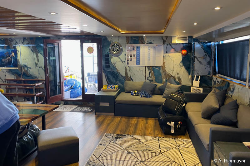 Weiter ging es zur Sea Serpent Excellence, die an diesem Tag einen kurzen Stopp einlegte. Da alle Kabinen leider belegt waren, blieb der Blick ins Schiffsinnere begrenzt. Was auffiel, war die Lagerung der Koffer im Außenbereich ohne Abdeckung. Die Ruhebereiche könnten eng werden, wenn alle gleichzeitig entspannen möchten, denn das Oberdeck bietet etwa zehn Liegeplätze. Je nach Gästestruktur werden passende Tauchguides eingesetzt, die entweder überwiegend Deutsch oder Englisch sprechen – ein wertvolles Detail für Gäste, die sich bei Briefings eine bestimmte Sprache wünschen.