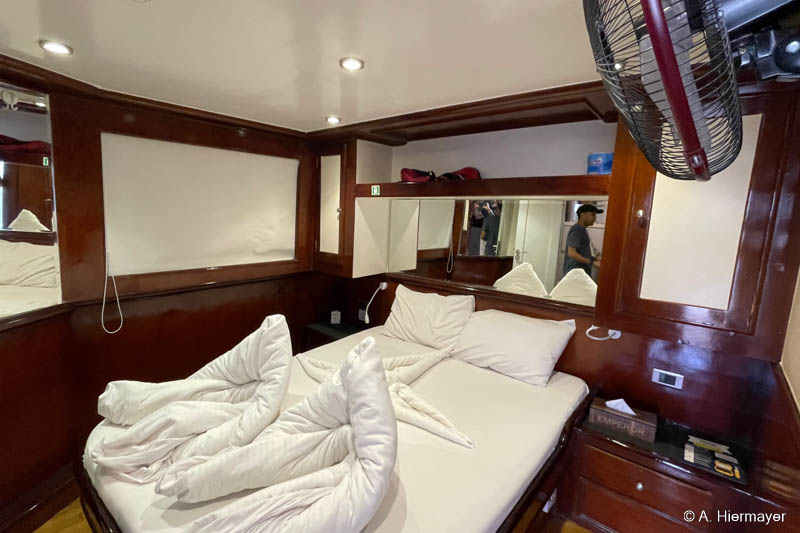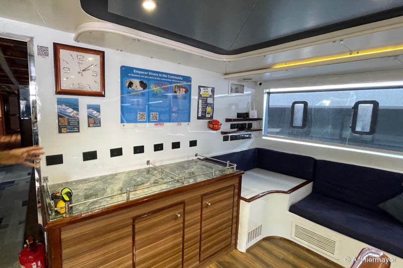 Das erste Schiff seiner Inspektion war die Emperor Elite, die bereits beim Betreten einen gepflegten Eindruck vermittelte. Sicherheit nimmt die Crew sehr ernst, was sich in Warnsystemen, Fluchtwegplänen und der allgemeinen Organisation widerspiegelt. Das Hauptdeck wirkt aufgeräumt und gut strukturiert. Unter Deck fallen die kräftigen Muster und Farben auf, die nicht jedermanns Geschmack sind, aber die Kabinen bieten viel Stauraum, individuell regulierbare Klimaanlagen und sogar Ventilatoren. Oberdeckkabinen haben kleine Fensteröffnungen und am Bug ist Rauchen erlaubt. Für Taucher wichtig: Die Zodiac‑Ausstattung ist gut, inklusive Leiter für den Einstieg.
