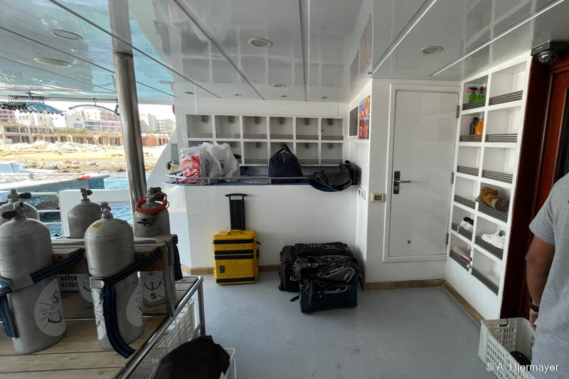 Ein weiterer Stopp war die Red Sea Aggressor II (MY Tranquility), die in einer älteren Gegend nahe des ehemaligen Beirut Hotels lag. Trotz des schlichten Umfelds machte das Schiff selbst einen ordentlichen Eindruck. Kabinen bieten viel Platz für Gepäck unter den Betten, Aufenthaltsbereiche wie Restaurant und Lounge sind komfortabel gestaltet. Am Sonnendeck gibt es ein Jacuzzi und genügend Raum zum Entspannen. Am Tauchdeck stehen Ladestationen bereit, und Rauchen ist ausschließlich am oberen Deck erlaubt.