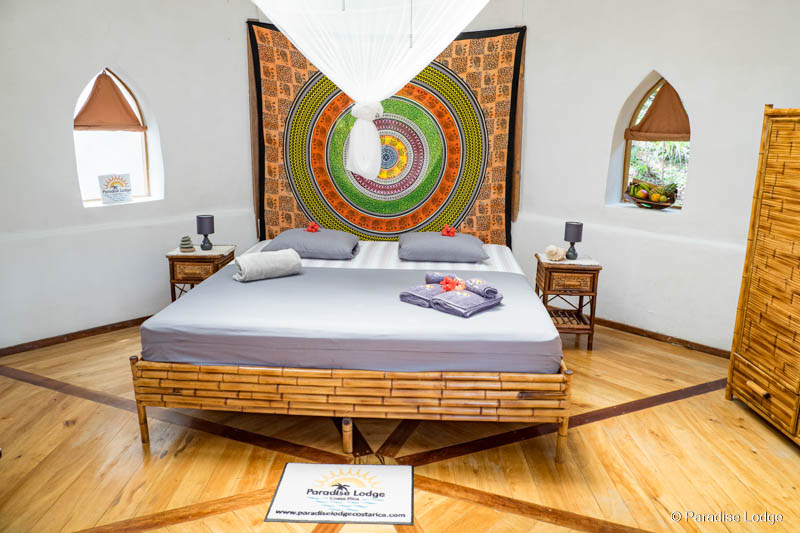 Der Jungle-Bungalow ist ein runder Holzbau auf Stelzen mit spektakulärer Aussichtsterrasse über das Diamante-Tal. Er bietet Platz für bis zu sechs Personen und verfügt über ein Doppelbett, ein Sofabett und zwei zusätzliche Matratzen auf der Galerie. Die kleine Küche ist voll ausgestattet, und der Wohnbereich lädt mit einem Esstisch für bis zu sechs Personen zum Verweilen ein. Das Badezimmer ist über den Wohnbereich zugänglich.