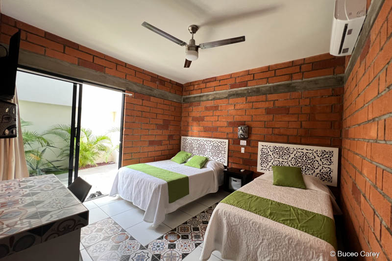 Die Villa Carey ist ein speziell für Taucher entworfenes Gästehaus in La Paz und steht nur für die Taucher und Begleitpersonen von Buceo Carey Divecenter zur Verfügung. Das Gebäude verfügt über mehrere Etagen mit Zimmern, Gemeinschaftsbereichen, Pool und Dachterrasse. Insgesamt stehen 18 Standardzimmer und 2 Suiten zur Verfügung; die Standardzimmer sind in der Regel mit einem Doppelbett und einem zusätzlichen Einzelbett ausgestattet, die Suiten verfügen über ein Kingsize‑Bett und einen Balkon mit Meerblick. Alle Zimmer haben ein eigenes Bad, Klimaanlage, WLAN und ausreichend Stauraum für Ausrüstung und Kleidung. Für Unterwasserfotografen gibt es eigene Arbeitsflächen mit 220‑Volt‑Anschlüssen (auch in europäischem Standard), 110‑Volt‑Steckdosen und USB‑Ports, sodass Akkus und Technik komfortabel vorbereitet werden können.
