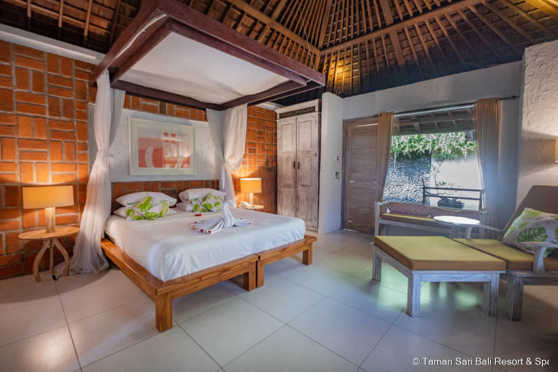 Die Garden View Rooms sind einfach und funktional eingerichtet, mit Klimaanlage, Safe, Minibar und einem halboffenen Badezimmer. Sie liegen eingebettet in die Gartenanlage und eignen sich gut für preisbewusste Gäste. Die Deluxe Rooms bieten etwas mehr Platz und sind näher am Strand gelegen, mit hochwertigerer Ausstattung und teilweise mit Meerblick. Besonders komfortabel sind die Beachfront Cottages, die direkt am Strand liegen und über eine eigene Terrasse mit Blick aufs Meer verfügen. Für mehr Privatsphäre stehen dir die Private Pool Villas zur Verfügung: großzügige Wohneinheiten mit eigenem Garten, Pool, Outdoor-Bad und separatem Wohnbereich – ideal für Paare oder Familien, die Ruhe und Komfort suchen. Alle Zimmer sind mit balinesischen Möbeln ausgestattet, WLAN ist in den meisten Bereichen verfügbar.