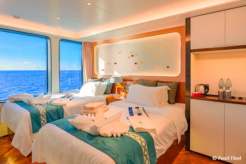 Zur Verfügung stehen 13 Kabinen, die sich in 1 Master-Suite auf dem Hauptdeck, 2 Junior-Suiten auf dem Hauptdeck und 10 Deluxe-Kabinen auf dem Oberdeck unterteilen. Alle Kabinen haben ein Kingsize- oder Doppelbett, ein einiges Bad mit Warmwasserdusche, HD-Fernseher mit Google Cast, ein Türschlosssystem mit Tastatur, Badeutensilien, Bade- und Handtücher, Kleiderhaken, Föhn, Safe, USB_Anschlüsse und ein Kommunikationssystem zwischen den Zimmern.